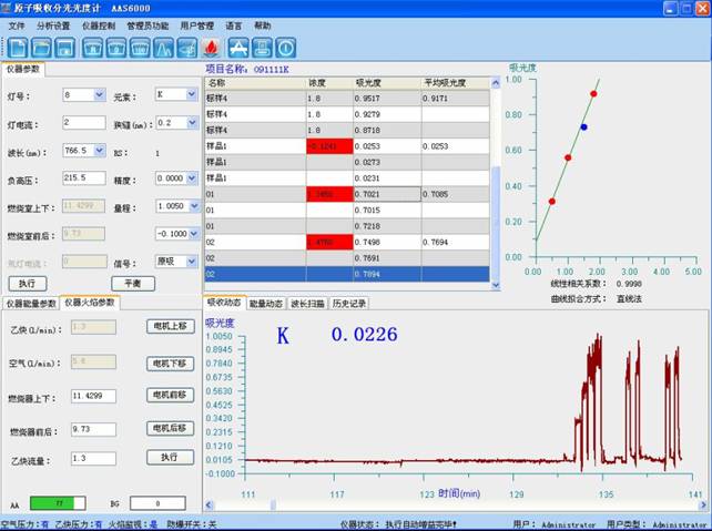 样机测试英文:于电子层接受到光谱分析仪可见光波长766.5nm处,采用良好氛围-乙炔火炎,以水调零,精确测量试液的吸光度,减去伴同试料的缺口试稀硫酸的吸光度,从任務曲线上直播得知为了响应的钾氧浓度。