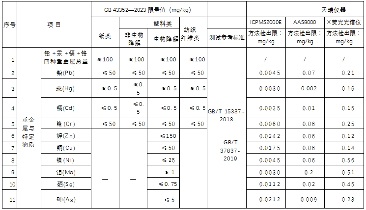 表1、重金属与特定元素限量值与检出限一览表