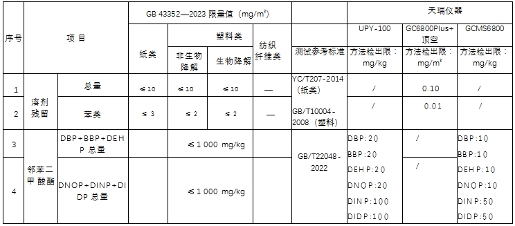 表 5. 溶剂残留、邻苯二甲酸酯类物资限量及检测一览表